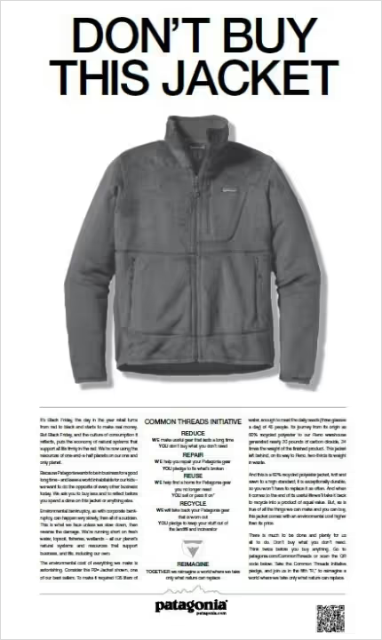 American clothing company Patagonia designs and sells outdoor apparel and gear. The brand is recognized for its strong commitment to environmental sustainability, ethical business practices, and advocacy for nature conservation.