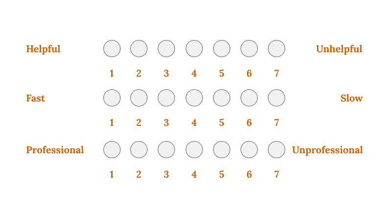 Each bipolar adjective anchors one end of the scale. The respondent then selects the point that best reflects their perception. A simple example might look like this:
