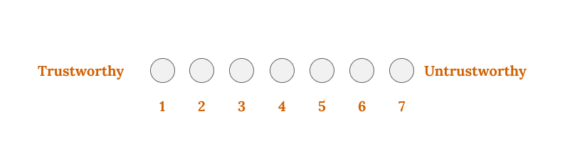 If “trustworthy” to “untrustworthy” is scored from 1 to 7, with 1 representing trustworthy, a mean score of 2.1 suggests respondents lean strongly toward trustworthy. A mean score of 5.9 suggests they lean toward untrustworthy.