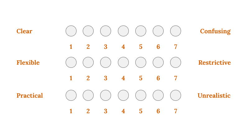 Good semantic differential scale questions need good adjective pairs. Poorly chosen endpoints are one of the most common sources of confusion, because respondents may not know what dimension they’re being asked to judge.