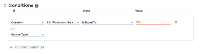 This section of the action item allows you to manage the conditional execution of it based on either a previous response, a contact attribute or a response property. You can combine 2 or more conditions using “OR/ AND” conditions by clicking on them. Please refer to our “Quick Start: Add a Condition to a Question”.