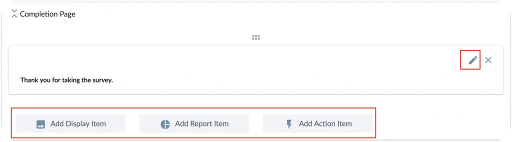 Your Completion Page comes with a basic thank you message, “Thank you for taking the survey.” Click the edit icon to change the message.